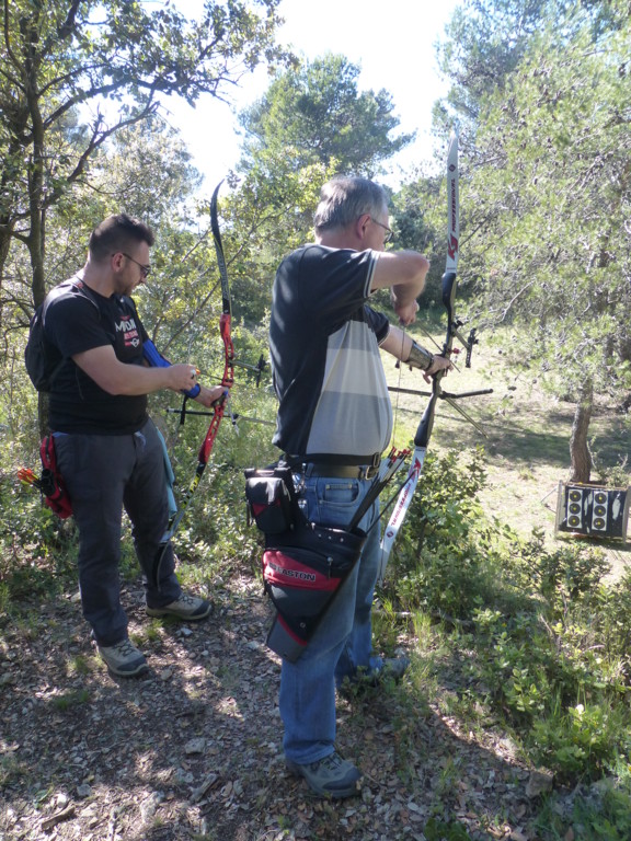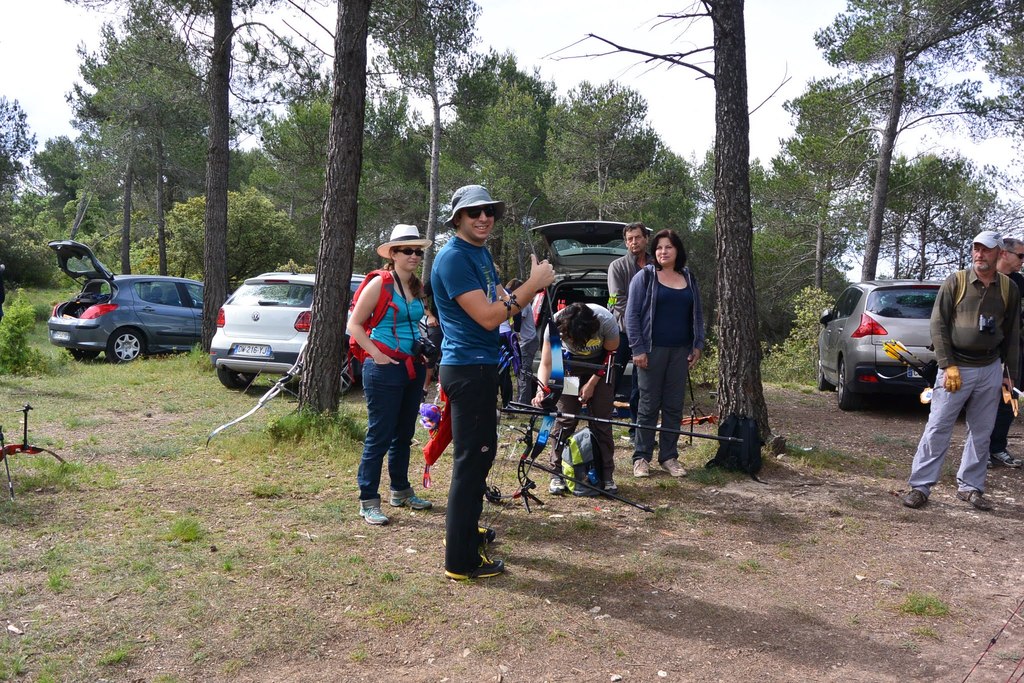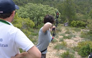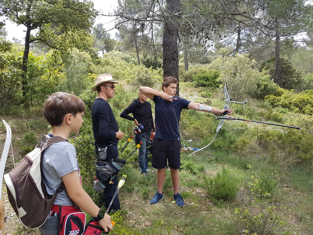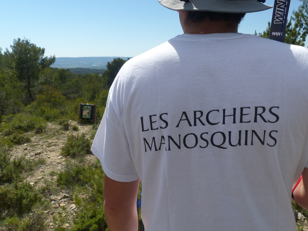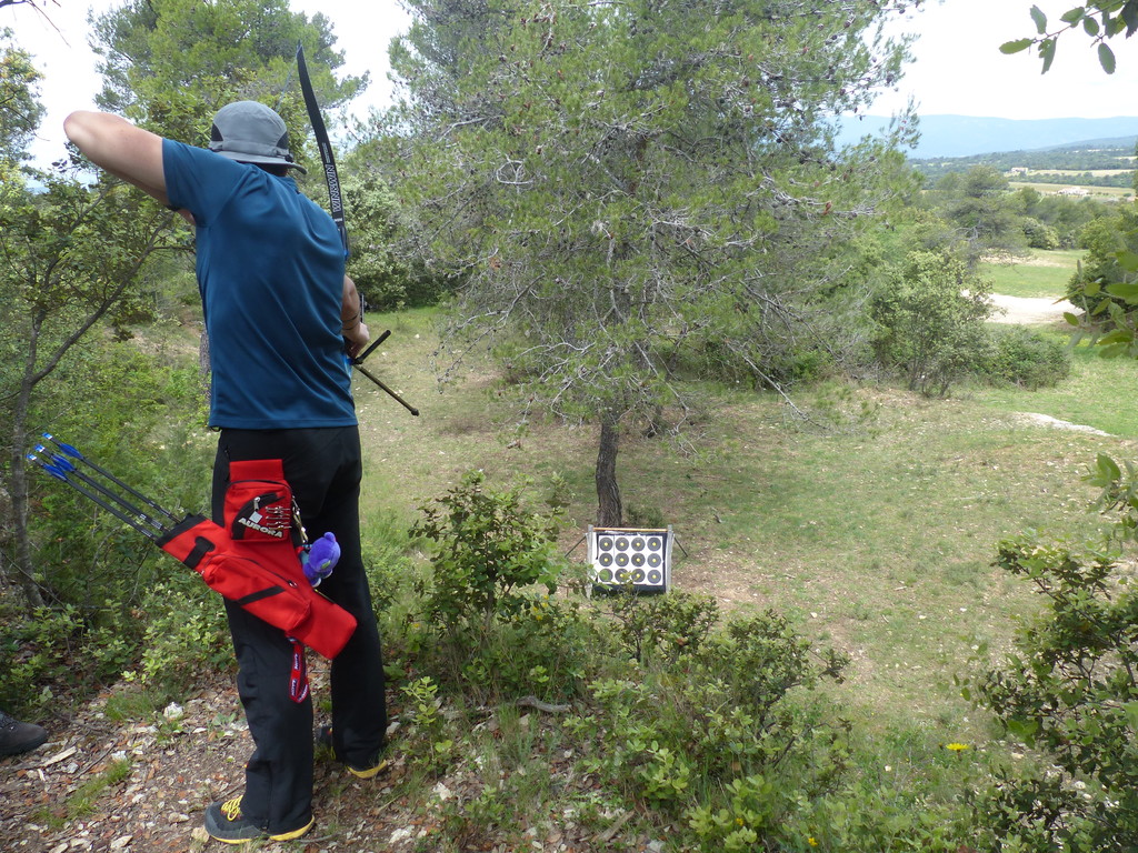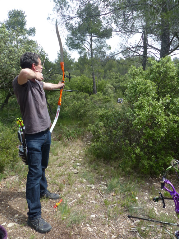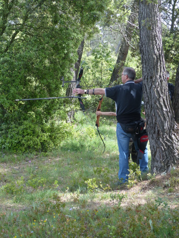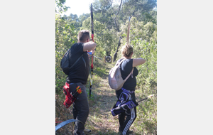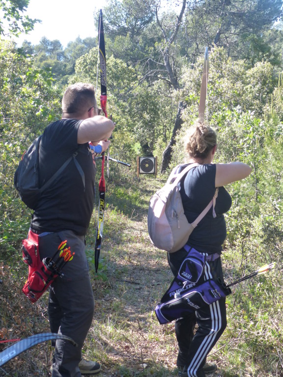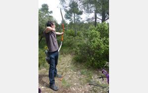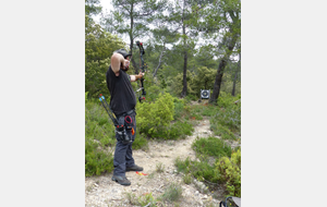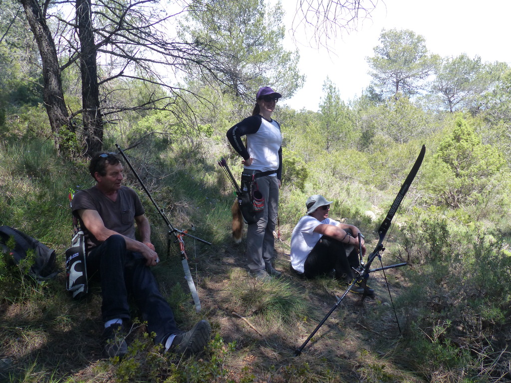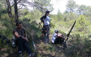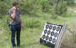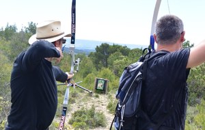 Brice et Thomas avaient blasonné les cibles et fléché l'accés la veille, nous n'avions plus qu'à monter les arcs et à tirer ! 19 archers manosquins et quelques accompagnatrices s'étaient donnés rendez-vous ce dimanche pour que les débutants découvrent le tir en parcours : Sur 15 cibles et en 4 pelotons , nous avons alterné blasons nature et campagne à des distances "raisonnables" (piquet blanc-bleu) conseillés par les habitués de ces disciplines. Un pique-nique dans la bonne humeur a permis de souffler à mi-parcours. A la fin des deux boucles prévues, plusieurs archers sont rentrés chez eux épuisés (mais ravis). Les plus accros sont repartis faire la troisième boucle : blasons campagne et piquet rouge ! Une dernière cible à 55 m vers 19h avec une lumière magnifique (et le soleil dans l'oeil ;) ... Nous espérons que chacun a apprécié cette journée et attrapé le virus du parcours !