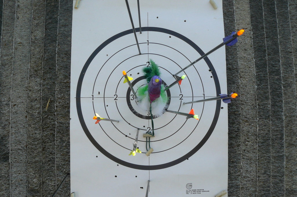 Les jeunes de l'école de tir , tirent l'oiseau avec leur arc habituel.